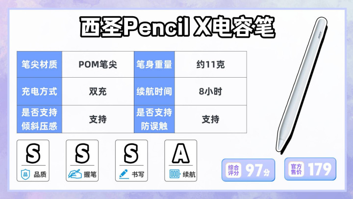 如果你想找一支能打败“同价位99%对手”的平替电容笔,那西圣Pencil X就是答案。一经发售,就被数码圈封为“Apple Pencil 平替王者”,千元原装级的手感与功能,全都压进百元档,直接把平替电容笔市场卷到没朋友。