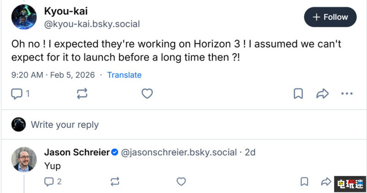 根据行业记者Jason Schreier的消息,目前Guerrilla Games的“工作室大部分人手”都在参与开发《地平线:猎人集结》的开发。这意味着就算是有《地平线3》,那么目前参与其中的人与资源也非常少。